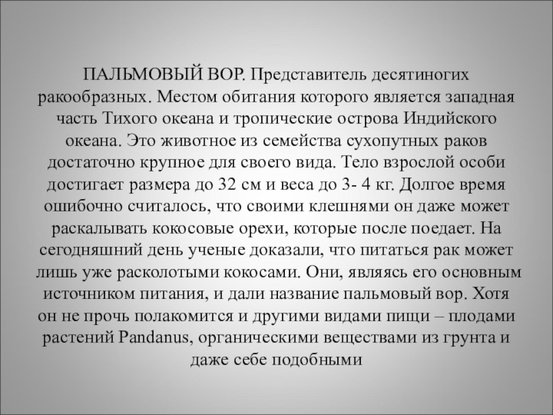 Тихого океана и тропические острова Индийского океана. Это животное из семейства сухопутных раков достаточно крупное для своего вида. Тело взрослой особи достигает размера до 32 см и веса до 3- 4 кг. Долгое время ошибочно считалось, что своими клешнями он даже может раскалывать кокосовые орехи, которые после поедает. На сегодняшний день ученые доказали, что питаться рак может лишь уже расколотыми кокосами. Они, являясь его основным источником питания, и дали название пальмовый вор. Хотя он не прочь полакомится и другими видами пищи – плодами растений Pandanus, органическими веществами из грунта и даже себе подобными