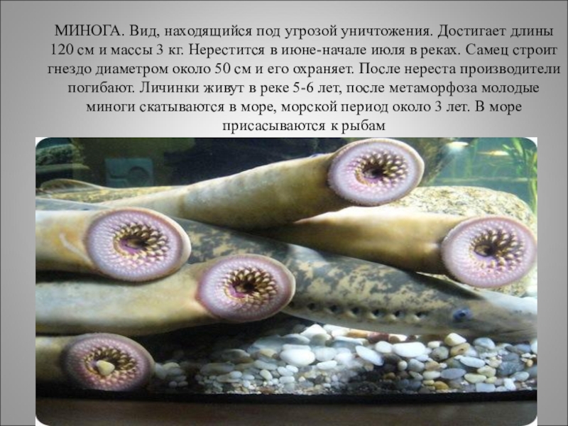 Слайд 68МИНОГА. Вид, находящийся под угрозой уничтожения. Достигает длины 120 см и