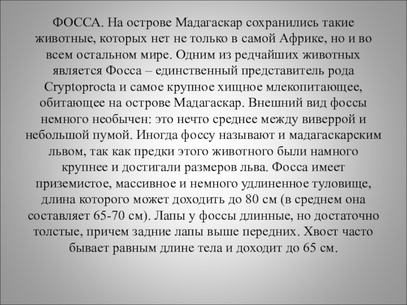 Слайд 42ФОССА. На острове Мадагаскар сохранились такие животные, которых нет не только