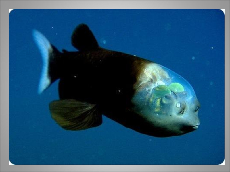 называть РЫБА С ПРОЗРАЧНОЙ ГОЛОВОЙ. У неё прозрачная голова, сквозь которую она может видеть своими трубчатыми глазами. Голова, сквозь которую рыба следит за добычей, помогает защитить глаза. Впервые открыта в 1939 году. Обитает на значительно большой глубине, поэтому не до конца была изучена. В частности не совсем понятным был принцип зрения рыбы. Полагалось, что она должна испытывать очень большие трудности ввиду того, что она может смотреть исключительно вверх. Только в 2009 году было полностью изучено строение глаза данной рыбы. По всей видимости при попытках изучить ее ранее рыба просто не переносила изменение давления.