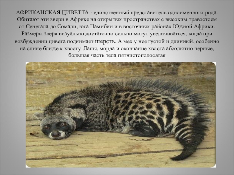 Слайд 17АФРИКАНСКАЯ ЦИВЕТТА - единственный представитель одноименного рода. Обитают эти звери в