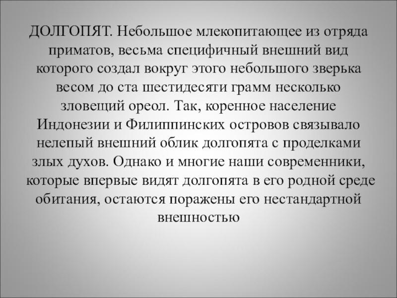 Слайд 56ДОЛГОПЯТ. Небольшое млекопитающее из отряда приматов, весьма специфичный внешний вид которого