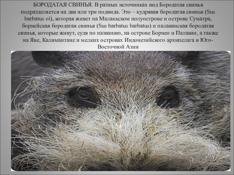 Слайд 26БОРОДАТАЯ СВИНЬЯ. В разных источниках вид Бородатая свинья подразделяется на два