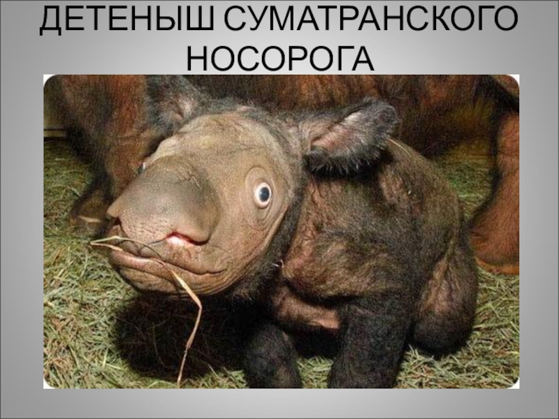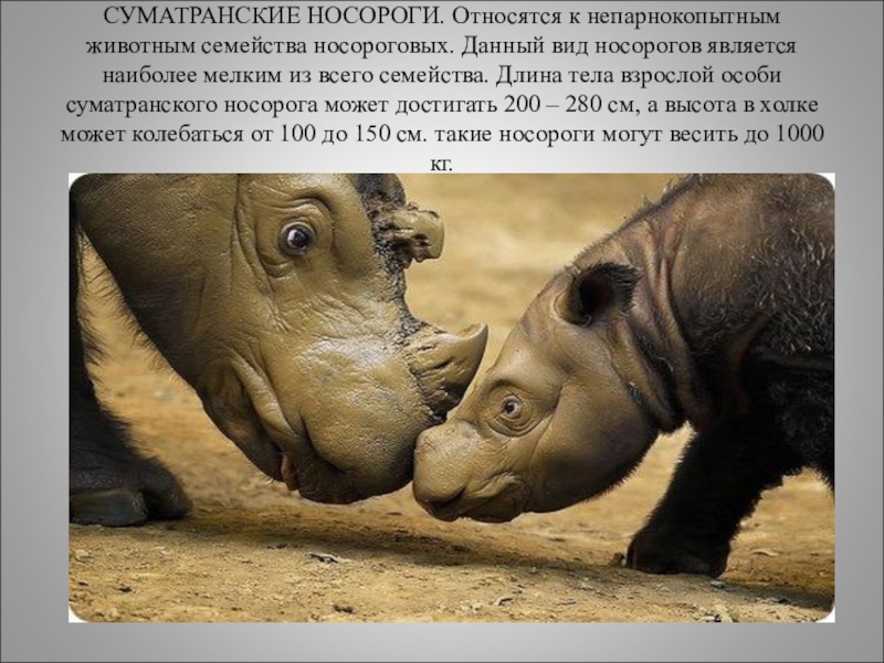 Слайд 27СУМАТРАНСКИЕ НОСОРОГИ. Относятся к непарнокопытным животным семейства носороговых. Данный вид носорогов