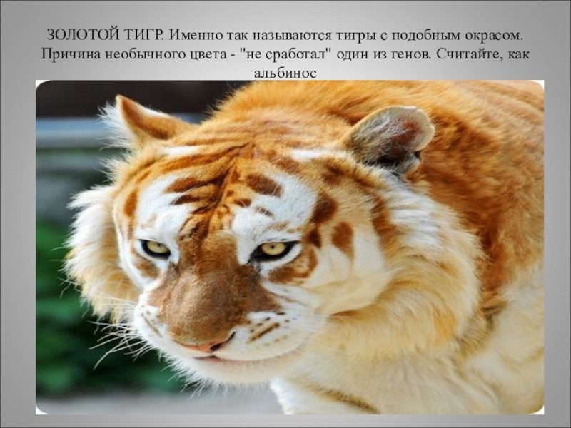 Слайд 67ЗОЛОТОЙ ТИГР. Именно так называются тигры с подобным окрасом. Причина необычного