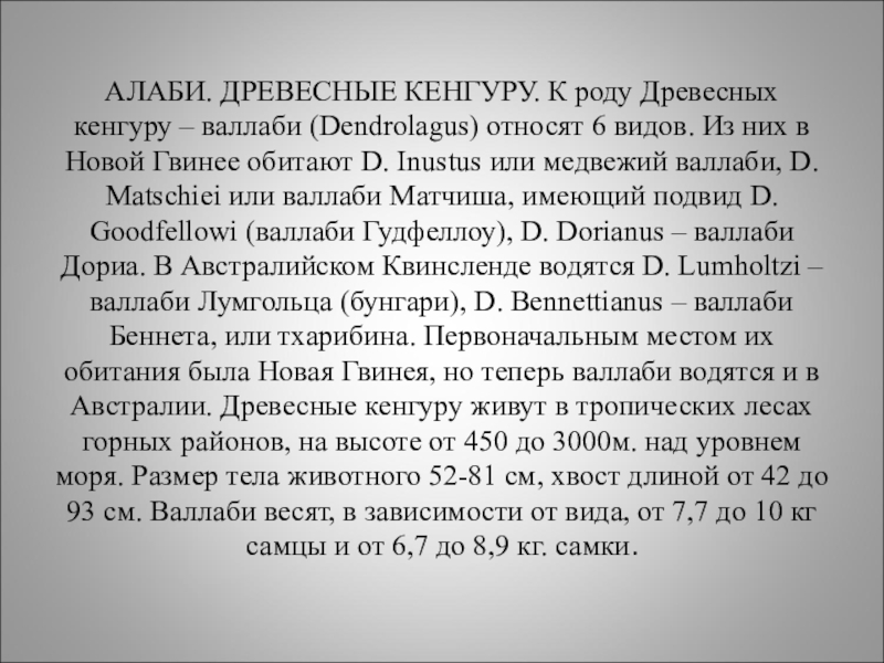 Слайд 39АЛАБИ. ДРЕВЕСНЫЕ КЕНГУРУ. К роду Древесных кенгуру – валлаби (Dendrolagus) относят