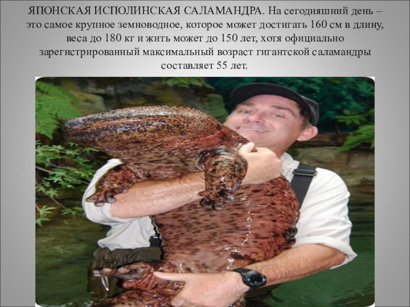 Слайд 25ЯПОНСКАЯ ИСПОЛИНСКАЯ САЛАМАНДРА. На сегодняшний день – это самое крупное земноводное,