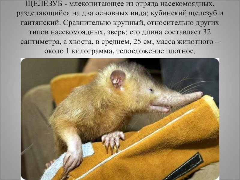 кубинский щелезуб и гаитянский. Сравнительно крупный, относительно других типов насекомоядных, зверь: его длина составляет 32 сантиметра, а хвоста, в среднем, 25 см, масса животного – около 1 килограмма, телосложение плотное.
