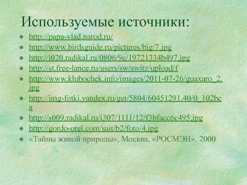 Эта презентация о самых удивительных и интересных птицах, их повадках, окраске, поведении, о самых примечательных и неожиданных сторонах их жизни.