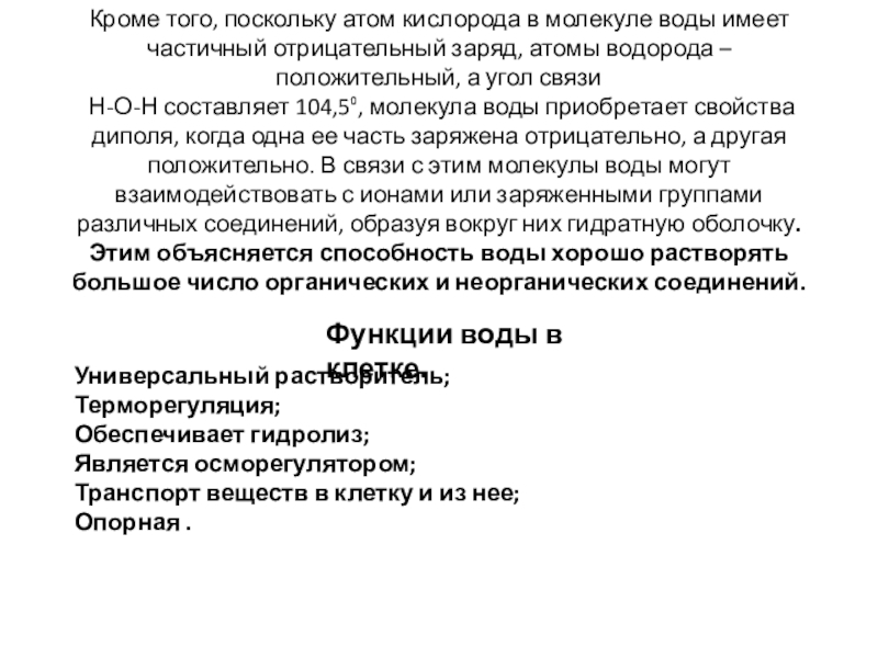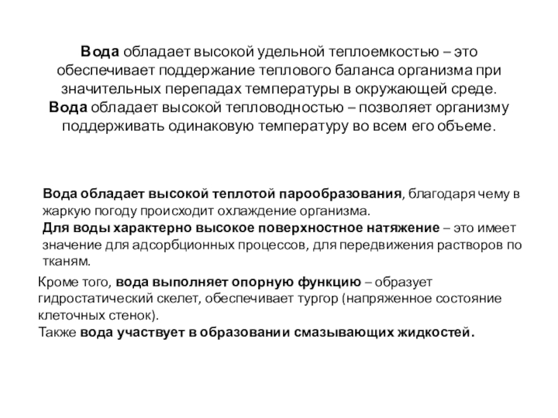 Для воды характерно высокое поверхностное натяжение – это имеет значение для адсорбционных процессов, для передвижения растворов по тканям.