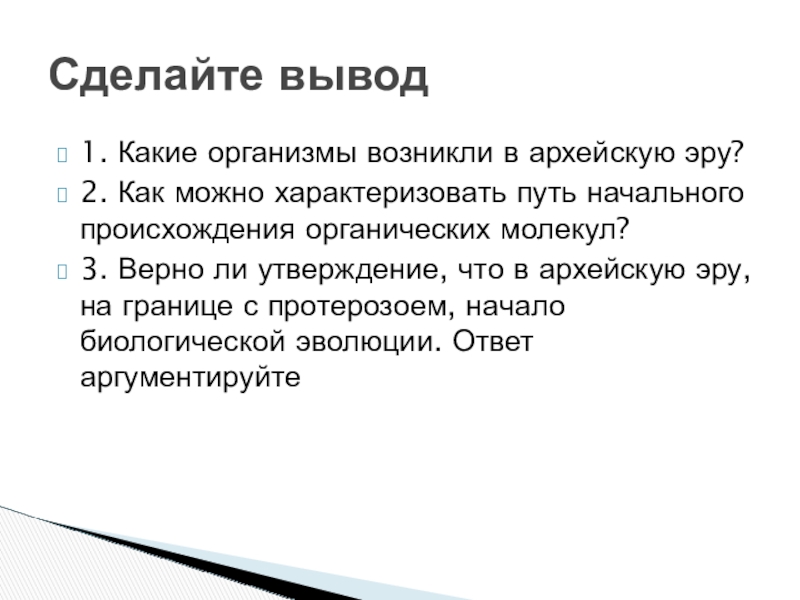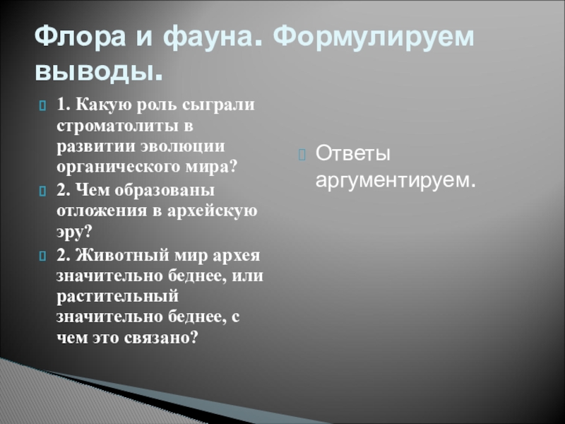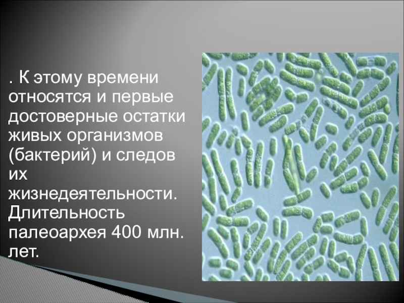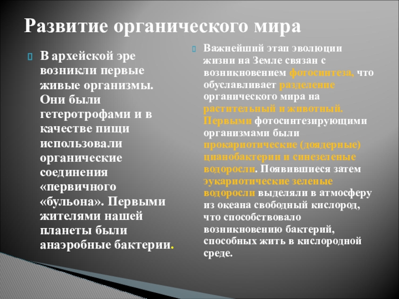 Важнейший этап эволюции жизни на Земле связан с возникновением фотосинтеза, что обуславливает разделение органического мира на растительный и животный. Первыми фотосинтезирующими организмами были прокариотические (доядерные) цианобактерии и синезеленые водоросли. Появившиеся затем эукариотические зеленые водоросли выделяли в атмосферу из океана свободный кислород, что способствовало возникновению бактерий, способных жить в кислородной среде.