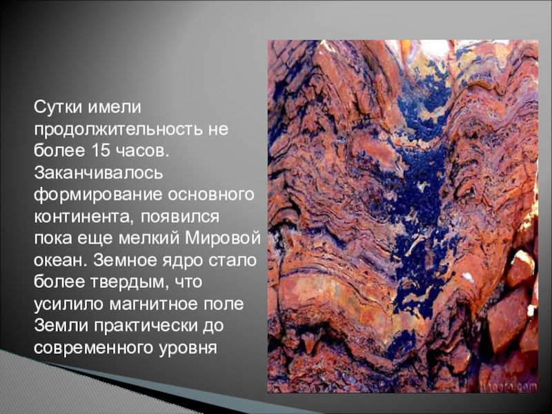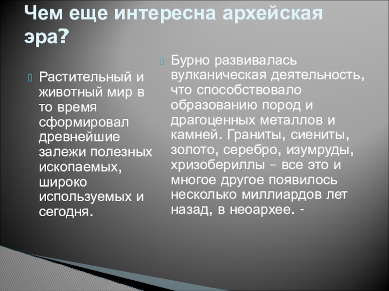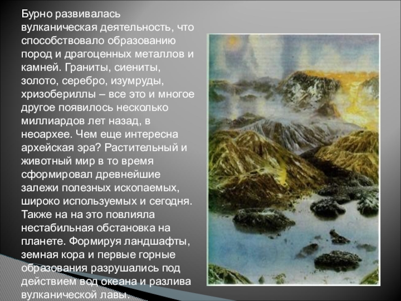 Бурно развивалась вулканическая деятельность, что способствовало образованию пород и драгоценных металлов и камней. Граниты, сиениты, золото, серебро, изумруды, хризобериллы – все это и многое другое появилось несколько миллиардов лет назад, в неоархее. -