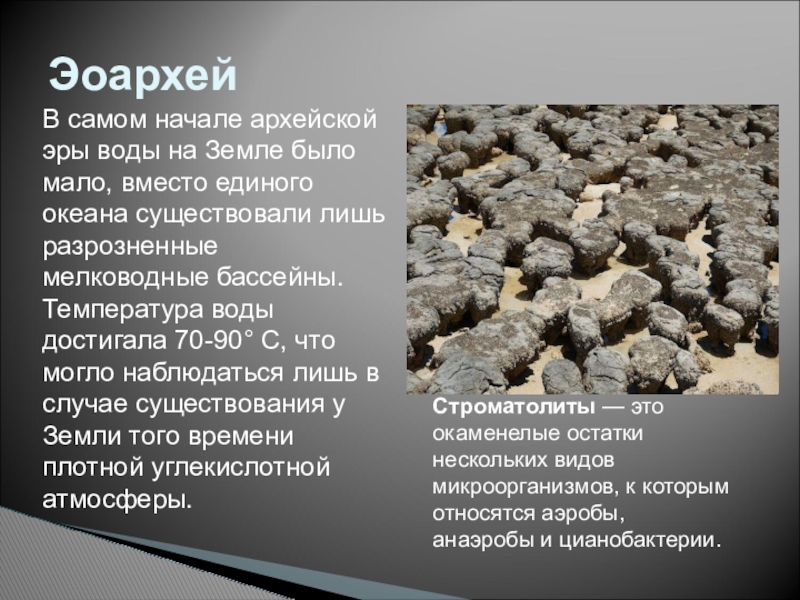 Строматолиты — это окаменелые остатки нескольких видов микроорганизмов, к которым относятся аэробы, анаэробы и цианобактерии.