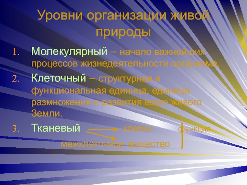 Уровни организации живой природыМолекулярный – начало важнейших процессов жизнедеятельности организма.Клеточный – структурная и функциональная единица, единица размножения