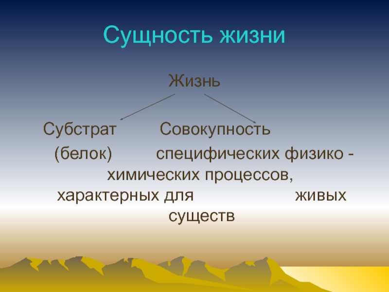 Сущность жизниЖизнь	Субстрат			Совокупность		(белок)		   специфических физико -  				химических процессов, 				характерных для 					живых существ
