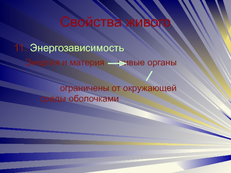 Свойства живого11. Энергозависимость   Энергия и материя		живые органы 				ограничены от окружающей 				   среды оболочками