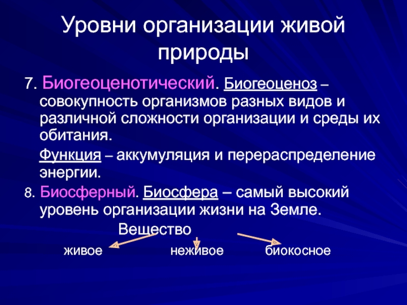 8. Биосферный. Биосфера – самый высокий уровень организации жизни на Земле.