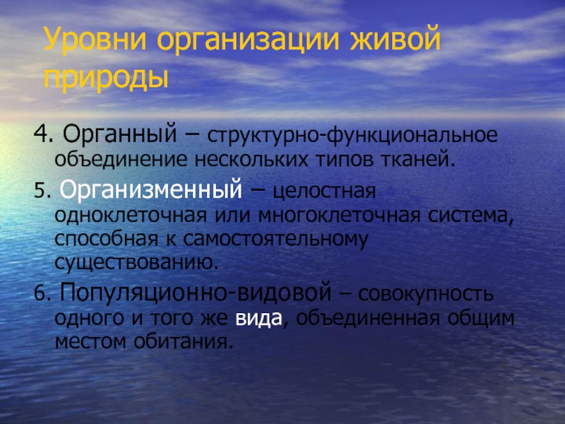 Уровни организации живой природы4. Органный – структурно-функциональное объединение нескольких типов тканей.5. Организменный – целостная одноклеточная или многоклеточная