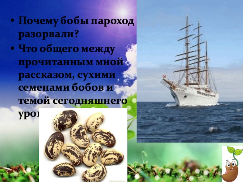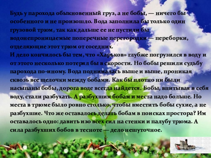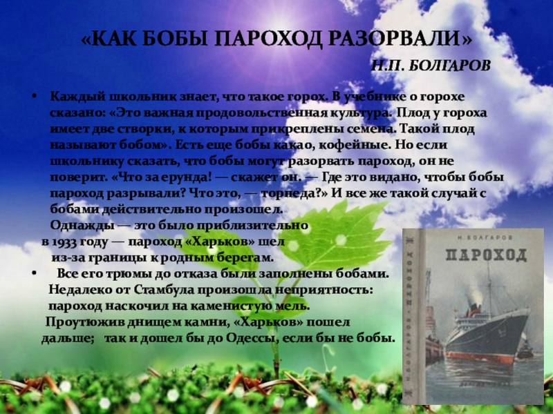 Каждый школьник знает, что такое горох. В учебнике о горохе сказано: «Это важная продовольственная культура. Плод у гороха имеет две створки, к которым прикреплены семена. Такой плод называют бобом». Есть еще бобы какао, кофейные. Но если школьнику сказать, что бобы могут разорвать пароход, он не поверит. «Что за ерунда! — скажет он. — Где это видано, чтобы бобы пароход разрывали? Что это, — торпеда?» И все же такой случай с бобами действительно произошел.