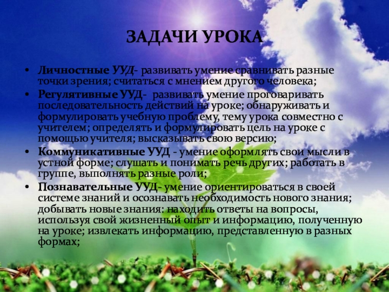 Регулятивные УУД- развивать умение проговаривать последовательность действий на уроке; обнаруживать и формулировать учебную проблему, тему урока совместно с учителем; определять и формулировать цель на уроке с помощью учителя; высказывать свою версию;