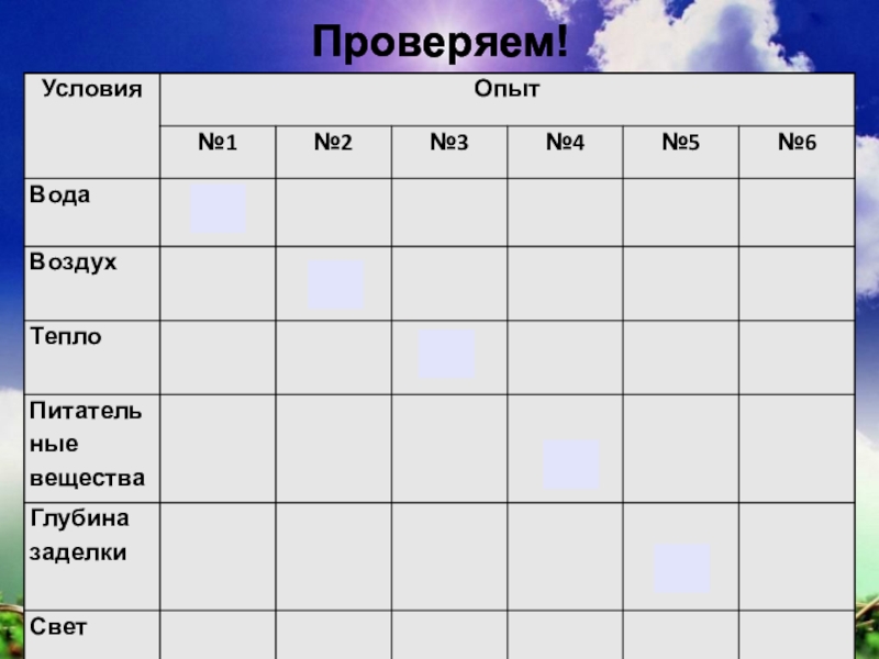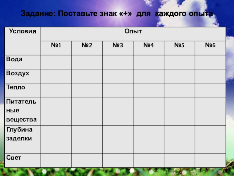 Слайд 20Задание: Поставьте знак «+» для каждого опыта
