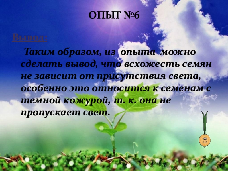 вывод, что всхожесть семян не зависит от присутствия света, особенно это относится к семенам с темной кожурой, т. к. она не пропускает свет.