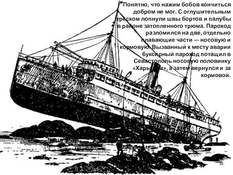 лопнули швы бортов и палубы в районе затопленного трюма. Пароход разломился на две, отдельно плавающие части — носовую и кормовую. Вызванный к месту аварии буксирный пароход потащил в Севастополь носовую половинку «Харькова», а затем вернулся и за кормовой.