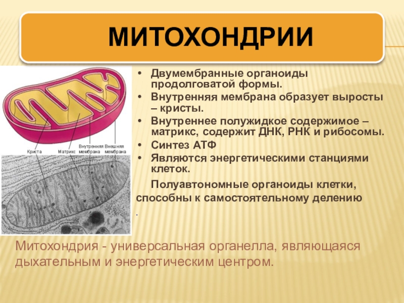 Митохондрия - универсальная органелла, являющаяся дыхательным и энергетическим центром.