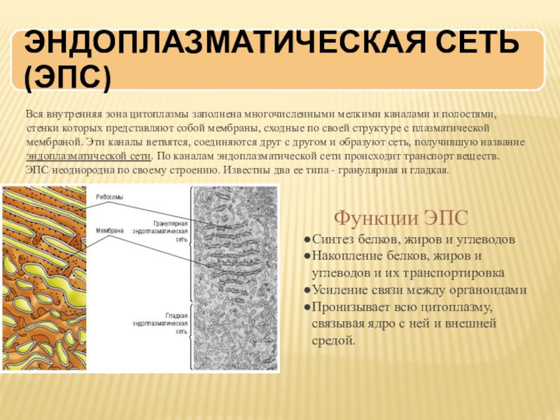 Вся внутренняя зона цитоплазмы заполнена многочисленными мелкими каналами и полостями, стенки которых представляют собой мембраны, сходные по своей структуре с плазматической мембраной. Эти каналы ветвятся, соединяются друг с другом и образуют сеть, получившую название эндоплазматической сети. По каналам эндоплазматической сети происходит транспорт веществ.