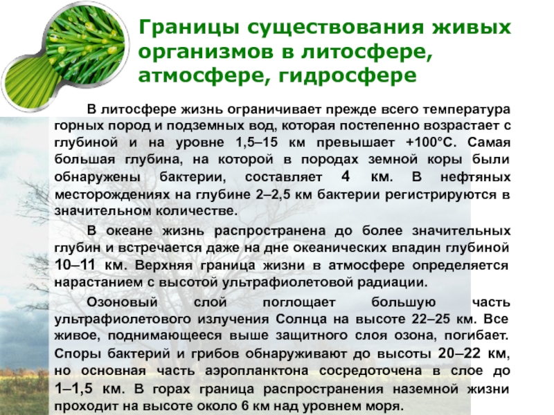 Слайд 12Границы существования живых организмов в литосфере, атмосфере, гидросфере