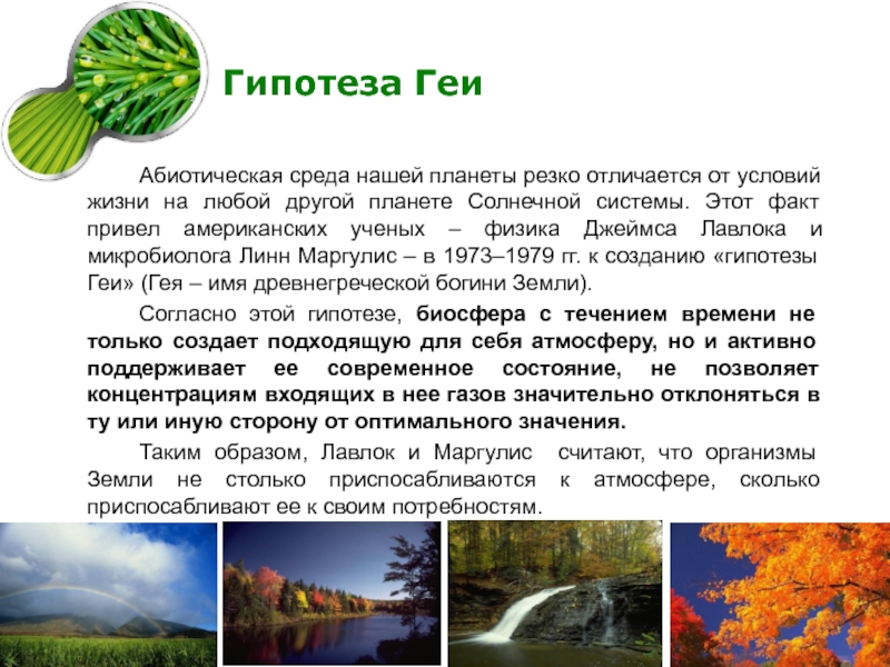 Согласно этой гипотезе, биосфера с течением времени не только создает подходящую для себя атмосферу, но и активно поддерживает ее современное состояние, не позволяет концентрациям входящих в нее газов значительно отклоняться в ту или иную сторону от оптимального значения.