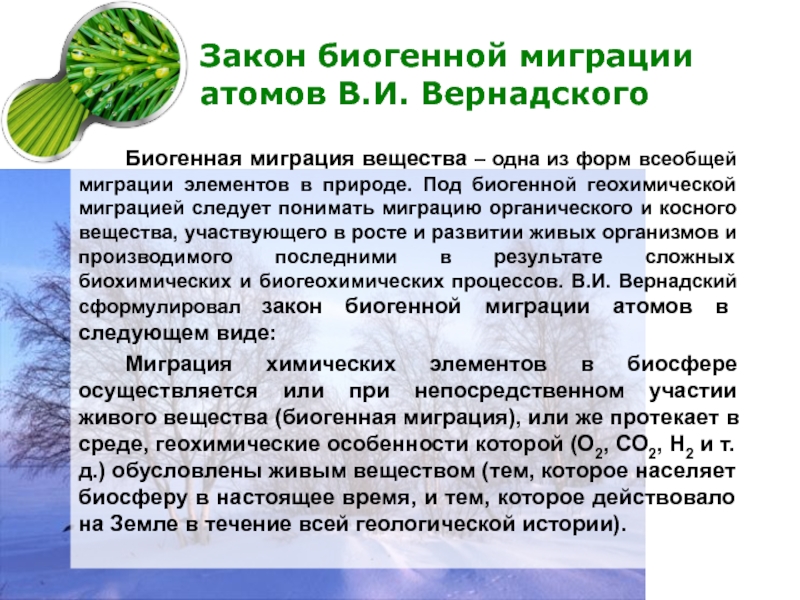 форм всеобщей миграции элементов в природе. Под биогенной геохимической миграцией следует понимать миграцию органического и косного вещества, участвующего в росте и развитии живых организмов и производимого последними в результате сложных биохимических и биогеохимических процессов. В.И. Вернадский сформулировал закон биогенной миграции атомов в следующем виде: