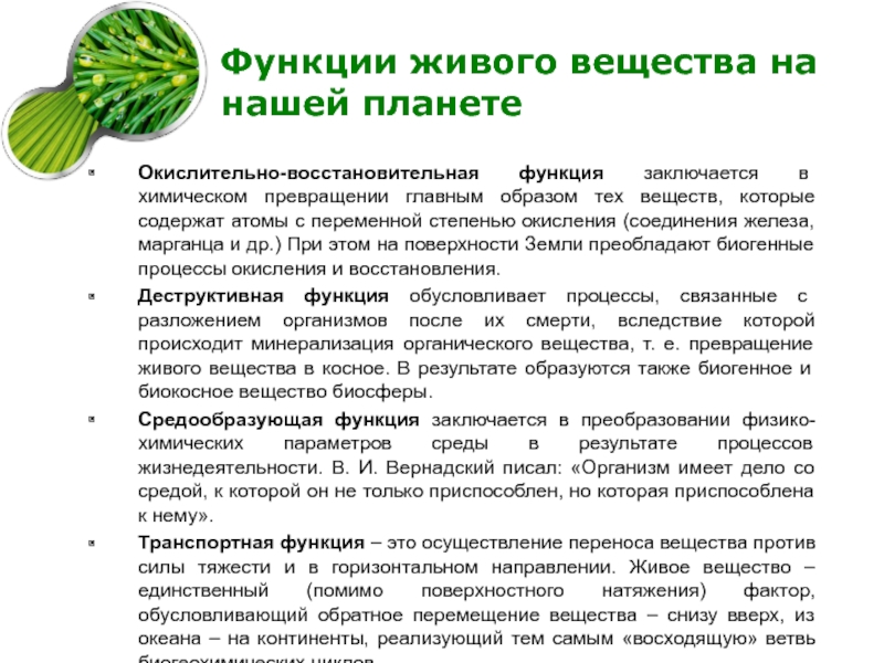 обладает некоторыми специфическими свойствами и выполняет в биосфере определенные биогеохимические функции.