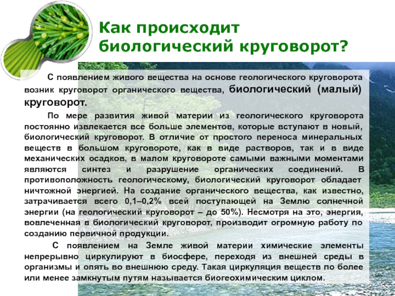 По мере развития живой материи из геологического круговорота постоянно извлекается все больше элементов, которые вступают в новый, биологический круговорот. В отличие от простого переноса минеральных веществ в большом круговороте, как в виде растворов, так и в виде механических осадков, в малом круговороте самыми важными моментами являются синтез и разрушение органических соединений. В противоположность геологическому, биологический круговорот обладает ничтожной энергией. На создание органического вещества, как известно, затрачивается всего 0,1–0,2% всей поступающей на Землю солнечной энергии (на геологический круговорот – до 50%). Несмотря на это, энергия, вовлеченная в биологический круговорот, производит огромную работу по созданию первичной продукции.