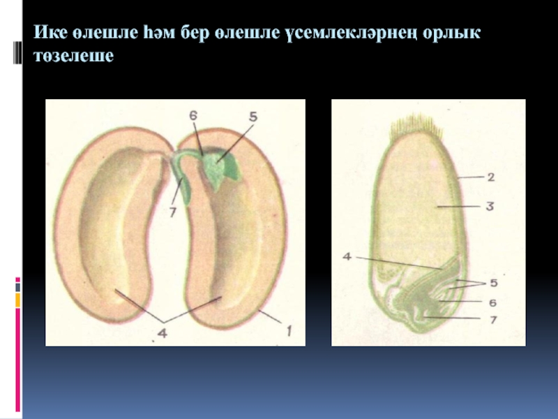 Слайд 3Ике өлешле һәм бер өлешле үсемлекләрнең орлык төзелеше
