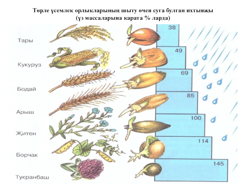 Слайд 5Төрле үсемлек орлыкларының шыту өчен суга булган ихтыяҗы (үз массаларына карата