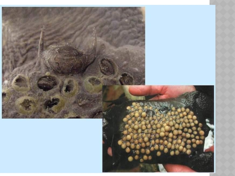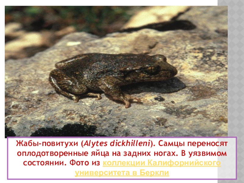 Слайд 64Жабы-повитухи (Alytes dickhilleni). Самцы переносят оплодотворенные яйца на задних ногах. В