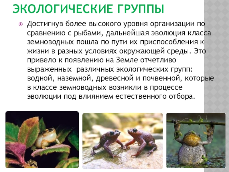 эволюция класса земноводных пошла по пути их приспособления к жизни в разных условиях окружающей среды. Это привело к появлению на Земле отчетливо выраженных различных экологических групп: водной, наземной, древесной и почвенной, которые в классе земноводных возникли в процессе эволюции под влиянием естественного отбора.