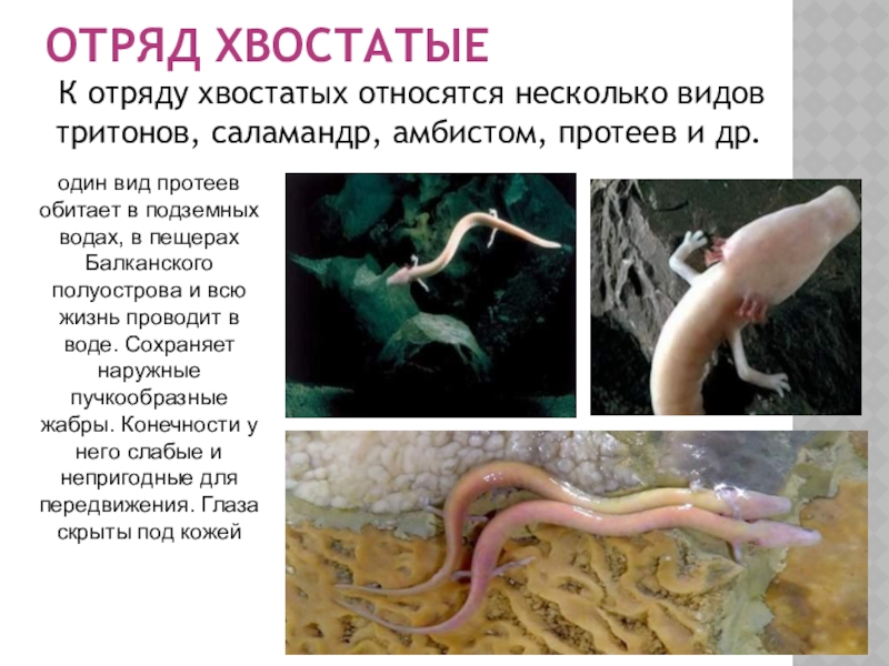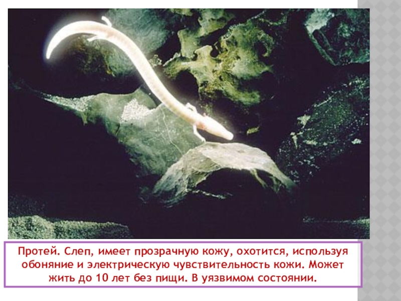 Слайд 55Протей. Слеп, имеет прозрачную кожу, охотится, используя обоняние и электрическую чувствительность