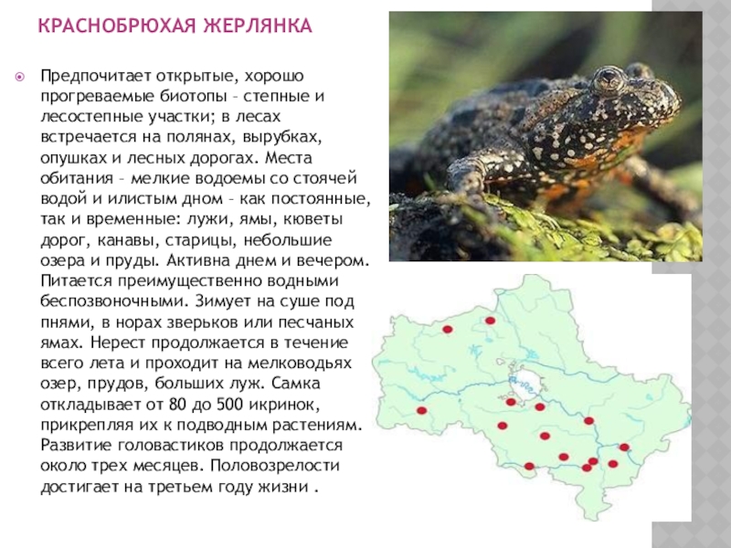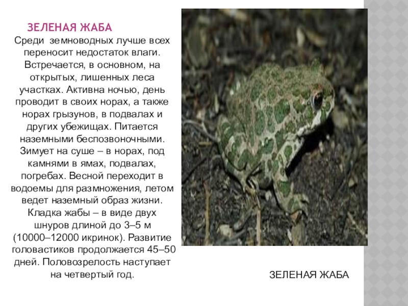 Среди земноводных лучше всех переносит недостаток влаги. Встречается, в основном,