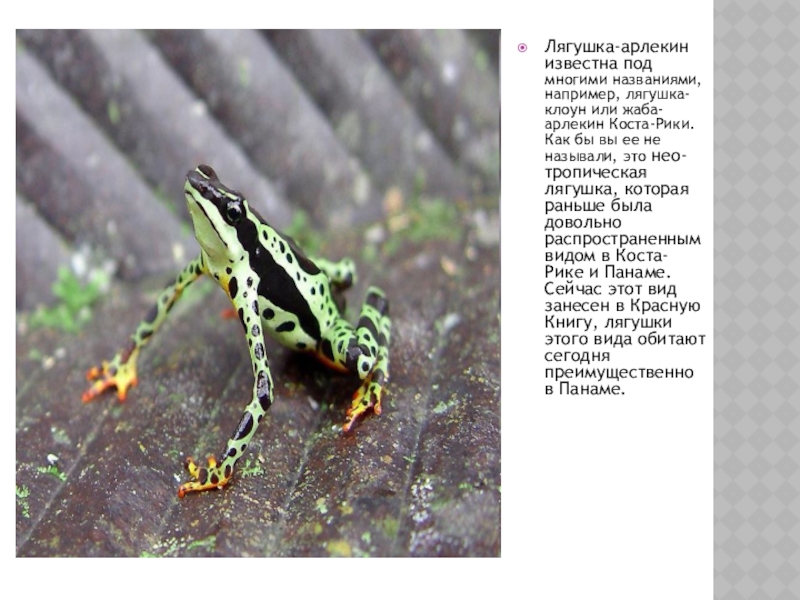 Лягушка-арлекин известна под многими названиями, например, лягушка-клоун или жаба-арлекин Коста-Рики. Как