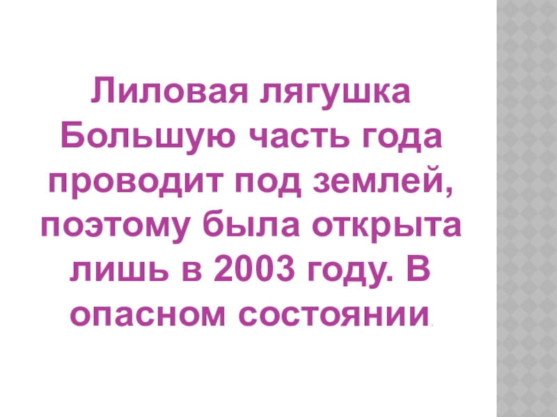 Слайд 57Лиловая лягушка Большую часть года проводит под землей, поэтому была открыта