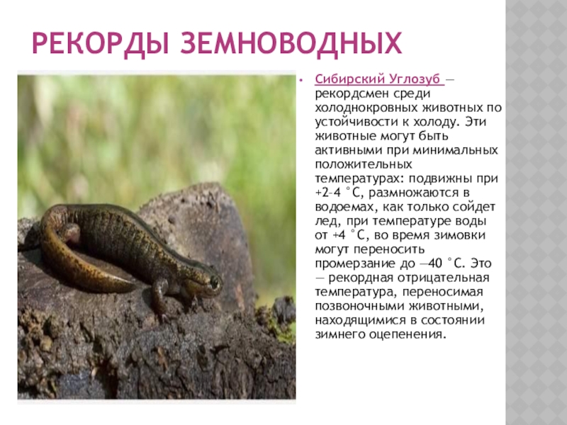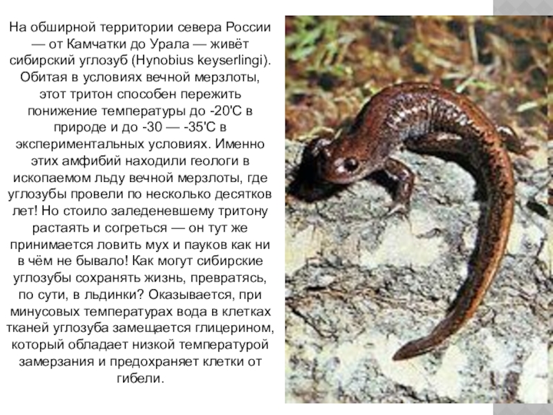 живёт сибирский углозуб (Hynobius keyserlingi). Обитая в условиях вечной мерзлоты, этот тритон способен пережить понижение температуры до -20'С в природе и до -30 — -35'С в экспериментальных условиях. Именно этих амфибий находили геологи в ископаемом льду вечной мерзлоты, где углозубы провели по несколько десятков лет! Но стоило заледеневшему тритону растаять и согреться — он тут же принимается ловить мух и пауков как ни в чём не бывало! Как могут сибирские углозубы сохранять жизнь, превратясь, по сути, в льдинки? Оказывается, при минусовых температурах вода в клетках тканей углозуба замещается глицерином, который обладает низкой температурой замерзания и предохраняет клетки от гибели.