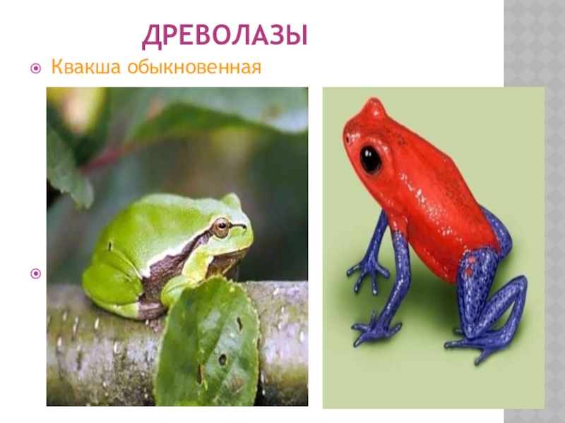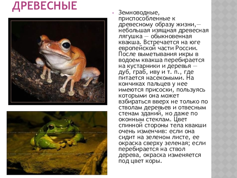 Земноводные, приспособленные к древесному образу жизни,— небольшая изящная древесная лягушка —