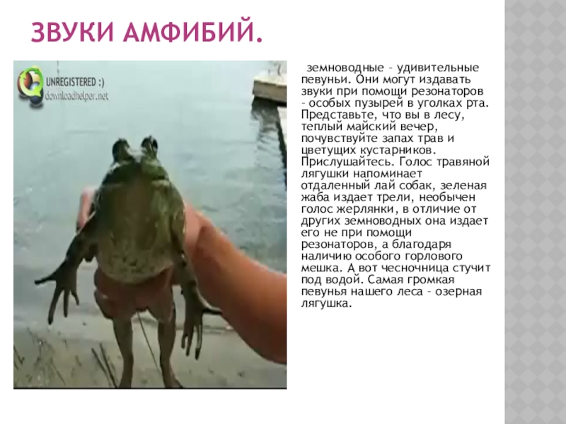 издавать звуки при помощи резонаторов – особых пузырей в уголках рта. Представьте, что вы в лесу, теплый майский вечер, почувствуйте запах трав и цветущих кустарников. Прислушайтесь. Голос травяной лягушки напоминает отдаленный лай собак, зеленая жаба издает трели, необычен голос жерлянки, в отличие от других земноводных она издает его не при помощи резонаторов, а благодаря наличию особого горлового мешка. А вот чесночница стучит под водой. Самая громкая певунья нашего леса – озерная лягушка.