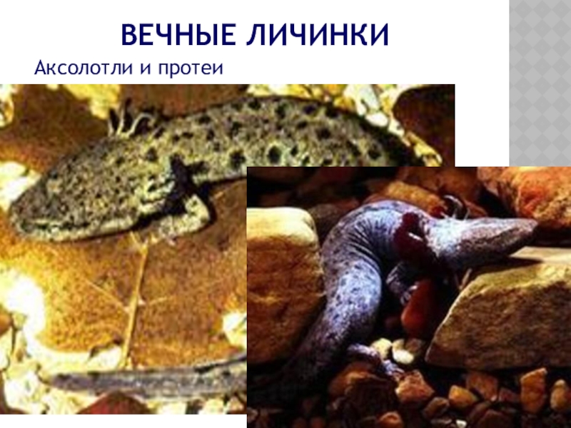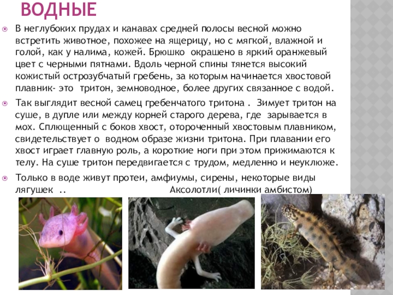 Только в воде живут протеи, амфиумы, сирены, некоторые виды лягушек .. Аксолотли( личинки амбистом)