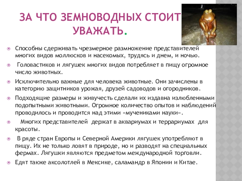 Слайд 6ЗА ЧТО ЗЕМНОВОДНЫХ СТОИТ УВАЖАТЬ.