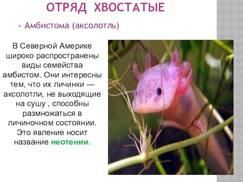 распространены виды семейства амбистом. Они интересны тем, что их личинки — аксолотли, не выходящие на сушу , способны размножаться в личиночном состоянии. Это явление носит название неотении.