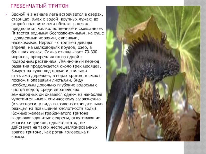 с водой, крупных лужах; во второй половине лета обитает в лесах, предпочитая мелколиственные и смешанные. Питается водными беспозвоночными, на суше – дождевыми червями, слизнями, насекомыми. Нерест – с третьей декады апреля, на мелководьях прудов, озер, в больших лужах. Самка откладывает 70-300 икринок, прикрепляя их по одной к подводным растениям. Личиночный период развития продолжается около трех месяцев. Зимует на суше под пнями и гнилыми стволами деревьев, в норах кротов, в ямах с песком и опавшими листьями. Виду необходимы довольно глубокие водоемы с чистой водой; среди европейских земноводных он оказался одним из наиболее чувствительных к химическому загрязнению (в частности, у вида выражена отрицательная реакция на повышение кислотности воды). Кожные железы гребенчатого тритона выделяют ядовитые секреты, отпугивающие многих хищников, однако этот яд не действует на таких неспециализированных врагов тритона, как ротан головешка и крысы.