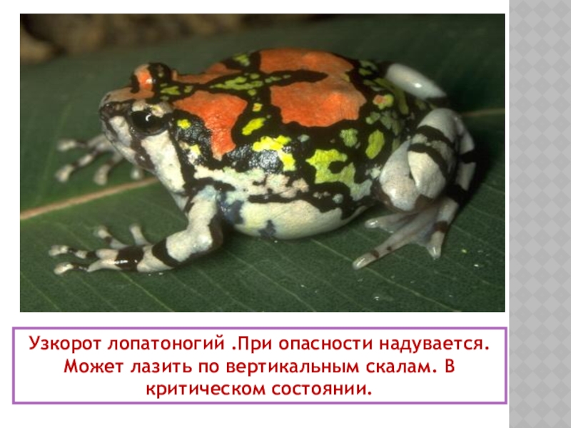 Слайд 62Узкорот лопатоногий .При опасности надувается. Может лазить по вертикальным скалам. В